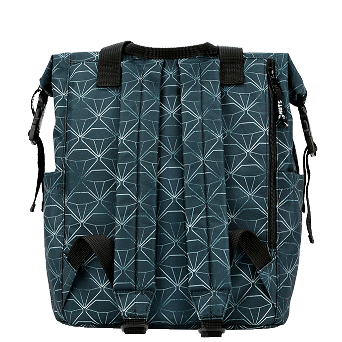 Com compartimento para computador portátil, duas bolsas laterais e bolsa nas costas com fecho.